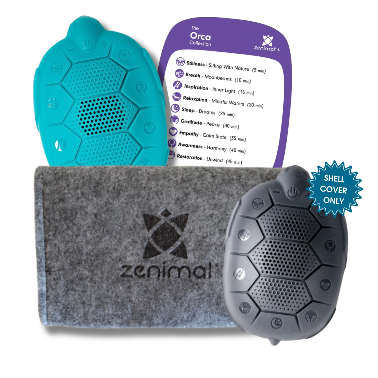 Create a centered, supportive learning environment with Zenimal’s mindfulness toolkit designed specifically for educators. This bundle brings together the screen-free Zenimal Kids device, the Orca Collection card, a hygienic replacement shell, and a wool carrying case—everything needed to build calm corners, support emotional regulation, and guide transitions with ease.